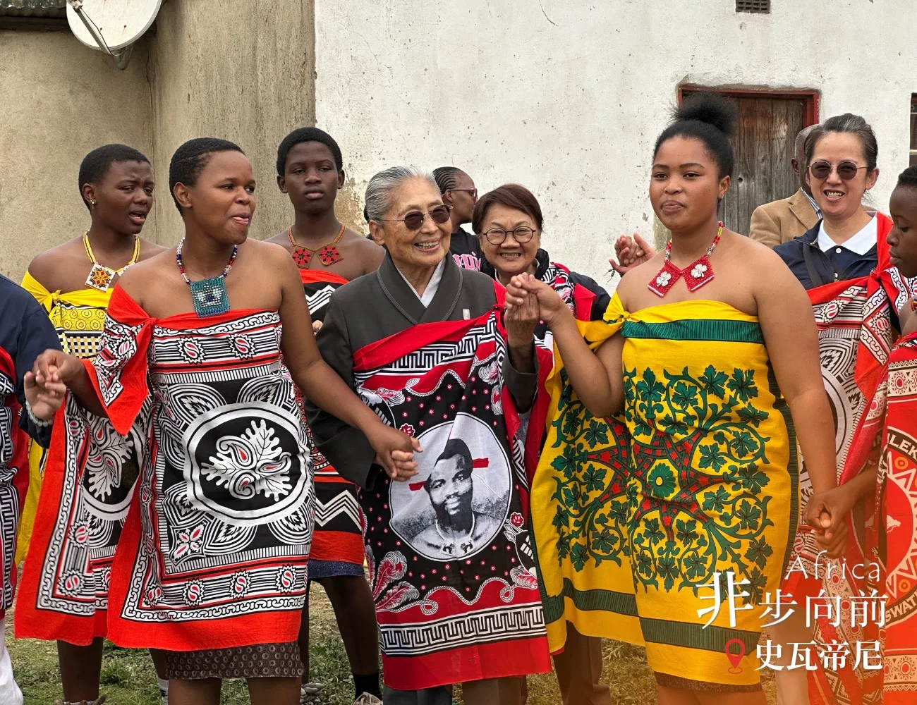 盧顏歐大愛農場的本土志工歡迎慈濟非洲關懷團,將非洲布致贈給每位團員,慈濟基金會副總執行長林靜憪身上的這一件,印有史瓦帝尼王國現任總統──恩史瓦帝三世(Mswati III)的頭像。