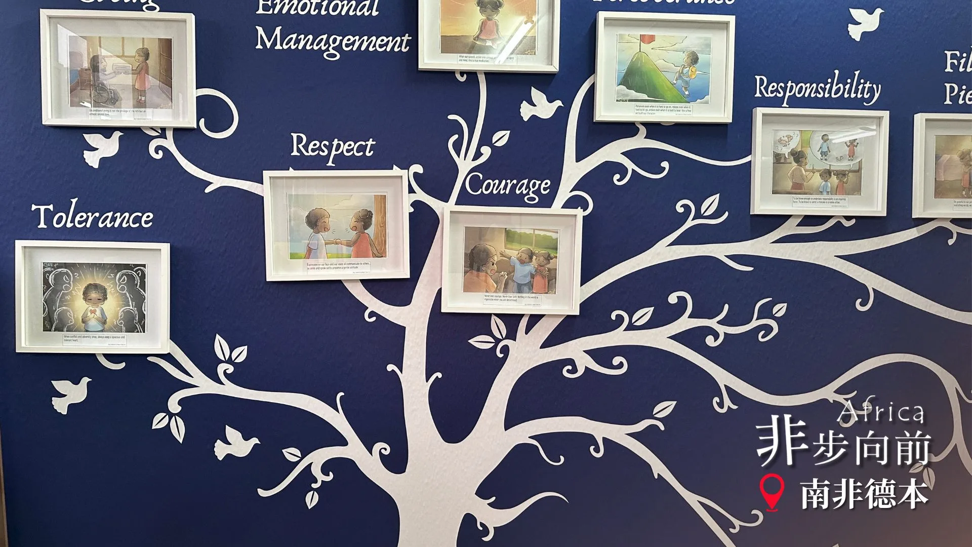 標示著感恩、尊重、勇氣、包容等 11 種美德,這面充滿創意的牆面,在南非德本愛丁頓小學,標示著慈濟深耕 25 年的品德教育新里程。