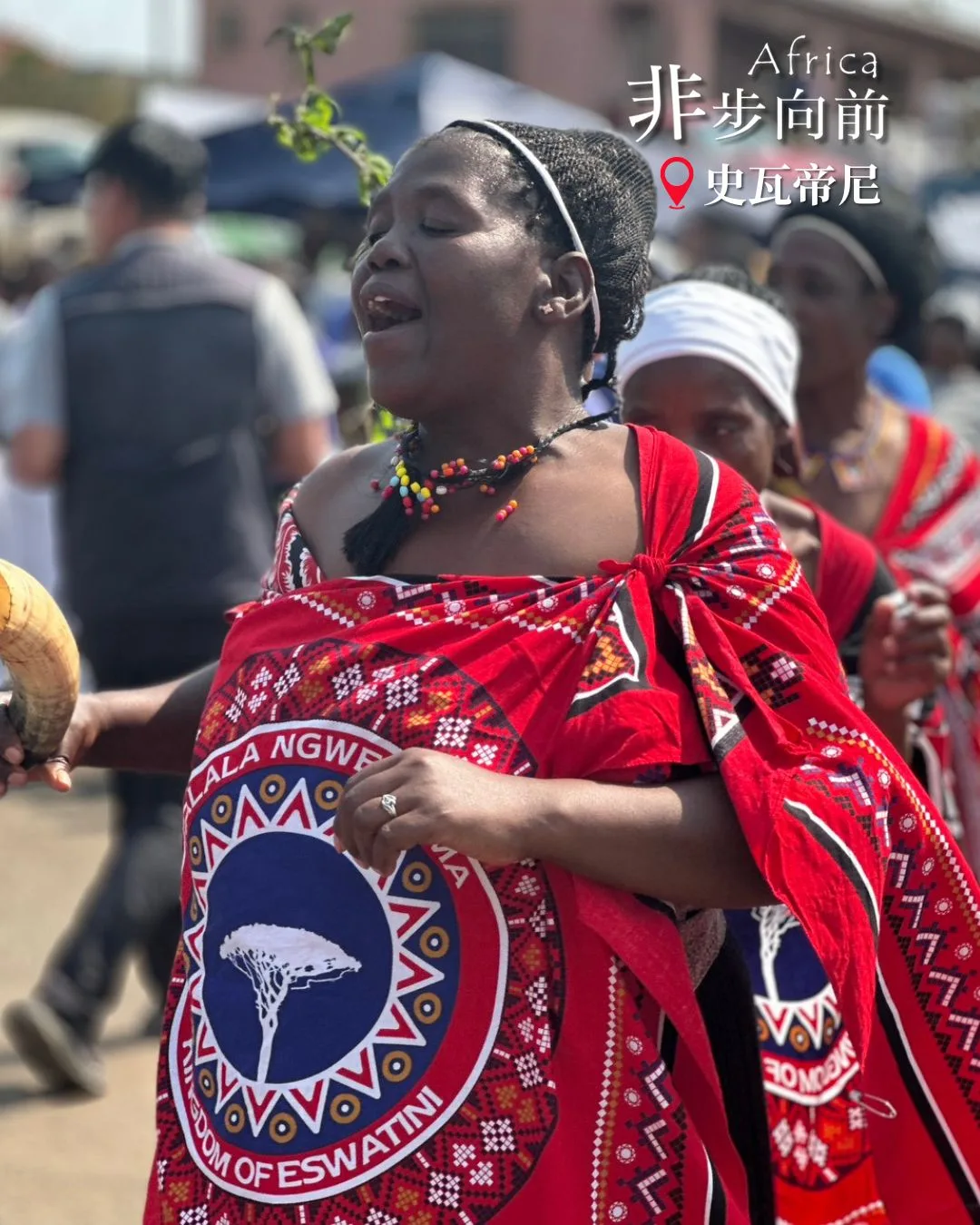 穿上史瓦帝尼傳統服飾,手拿牛角號角,本土志工載歌載舞,用無比的熱情與誠意歡迎慈濟非洲關懷團。