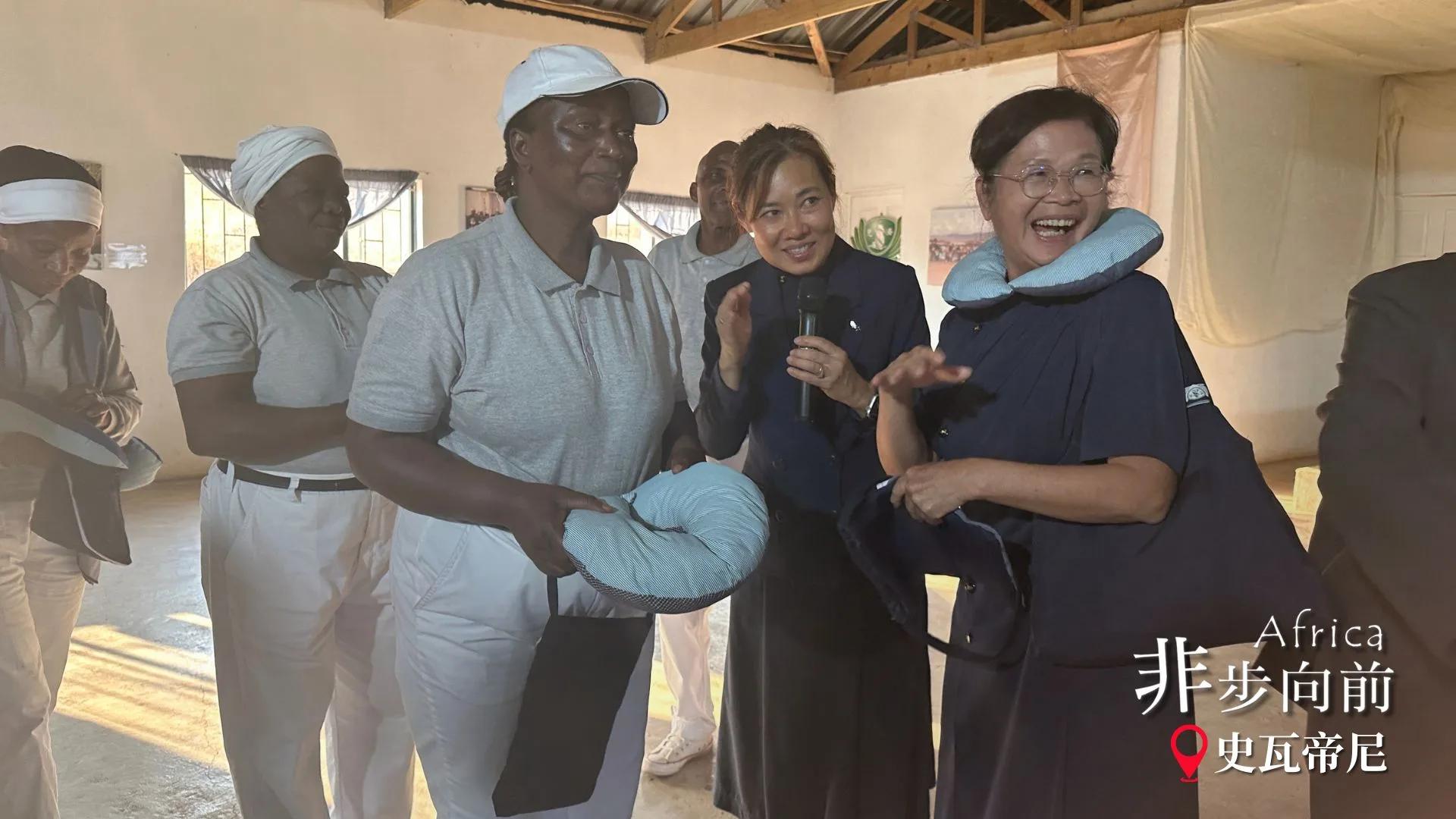 史瓦帝尼本土志工用回收的碎布做成抱枕送給三間醫院,這天也致贈飛行枕給從台灣來的慈濟非洲關懷團成員。
