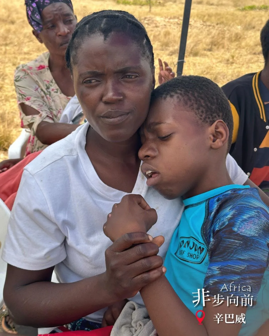 一名婦人抱著 14 歲的外甥,在慈濟於辛巴威蒙多羅大愛農場的發放現場,格外引人注目。