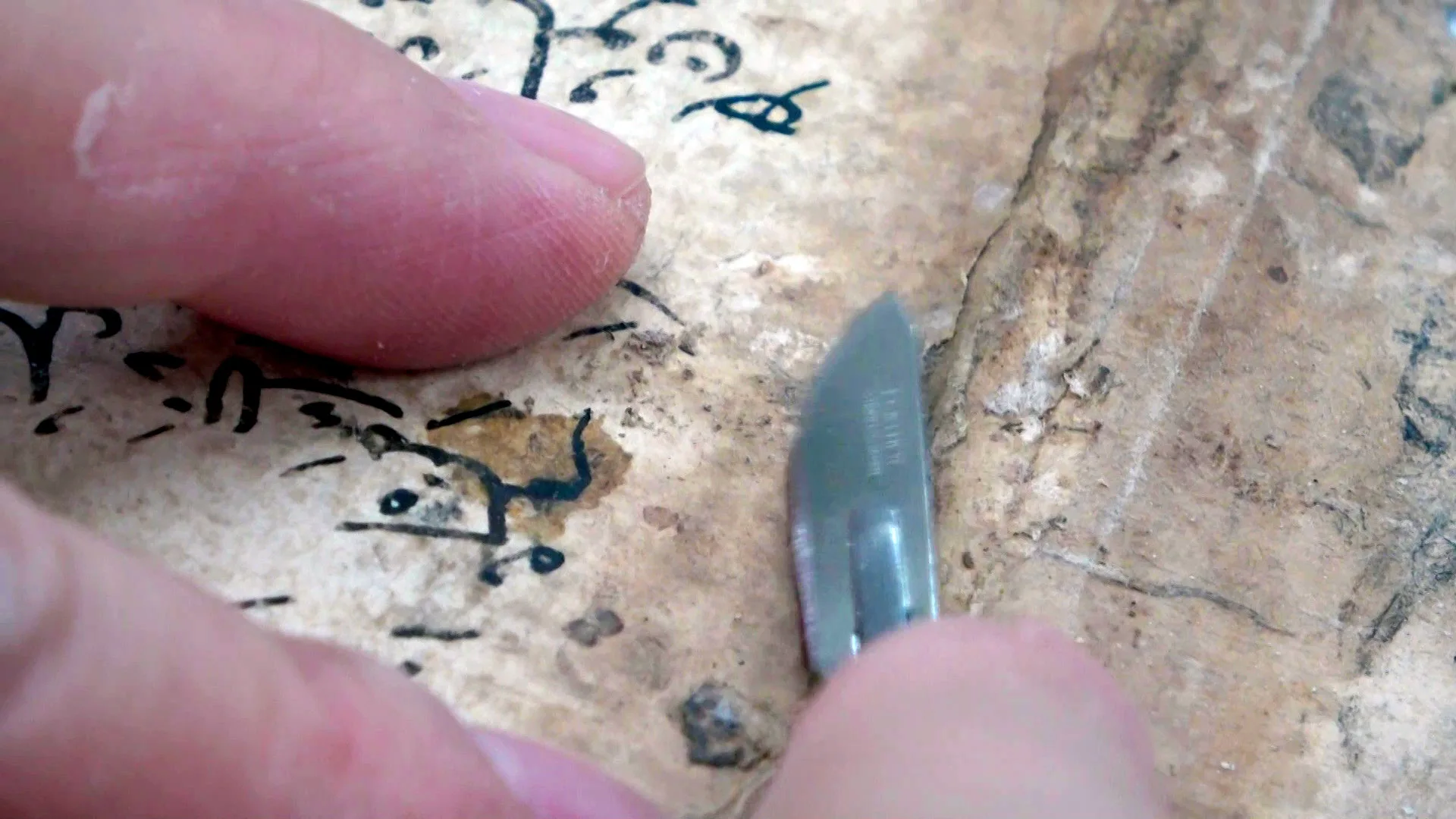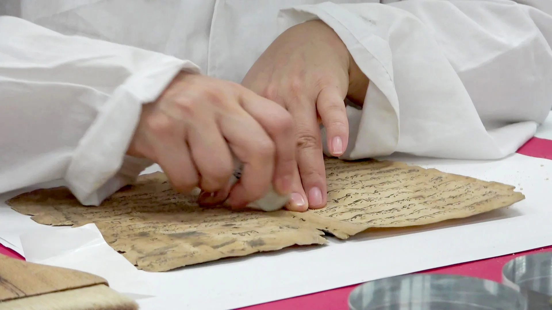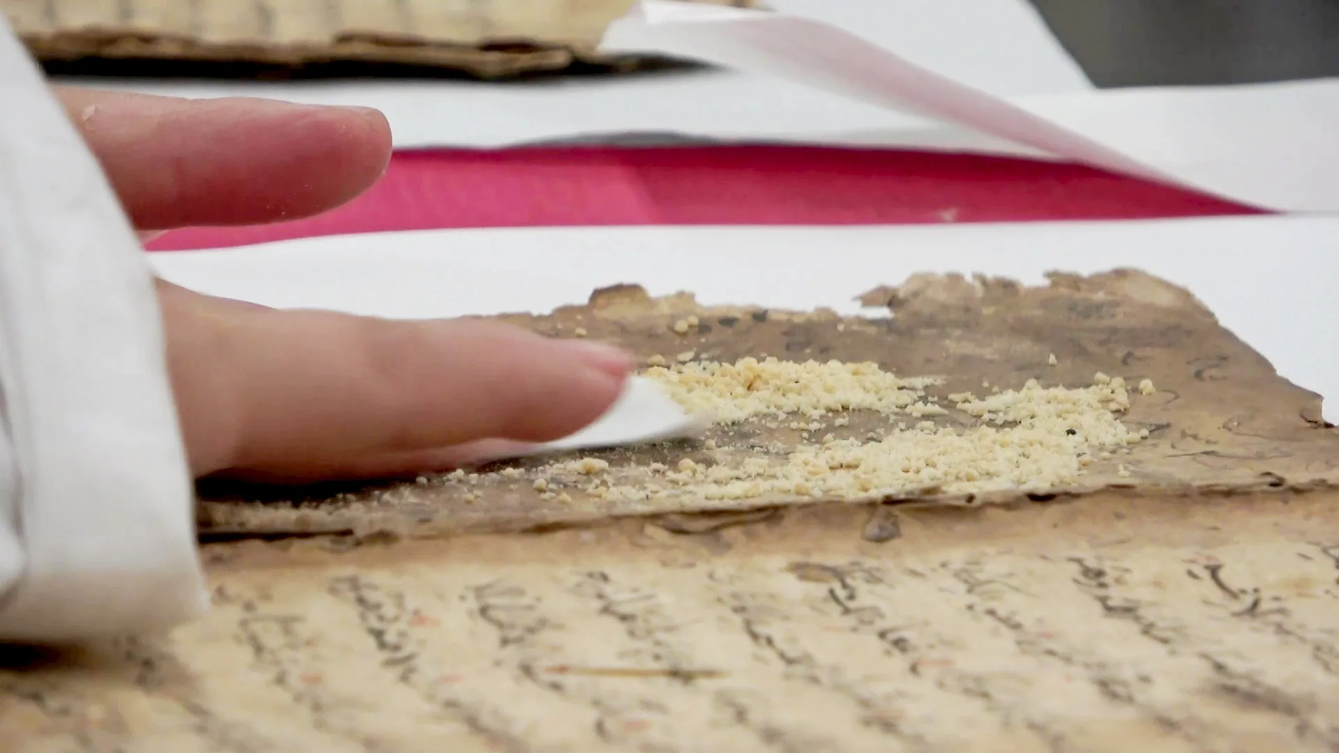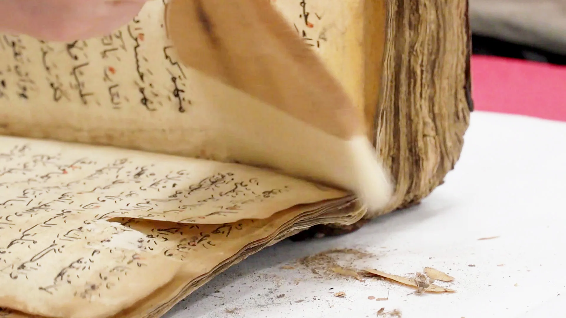 這本古蘭經所使用的紙張是堅韌的麻紙,讓它得以留存至今,但也因為如此「才能藏這麼多東西在裡面,需要花很多時間來刷」,光是將其中一整頁清乾淨,徐美文前後要清理四到五次,先用軟毛刷逐頁清潔,再用橡皮擦、橡皮粉,進行乾式清潔。