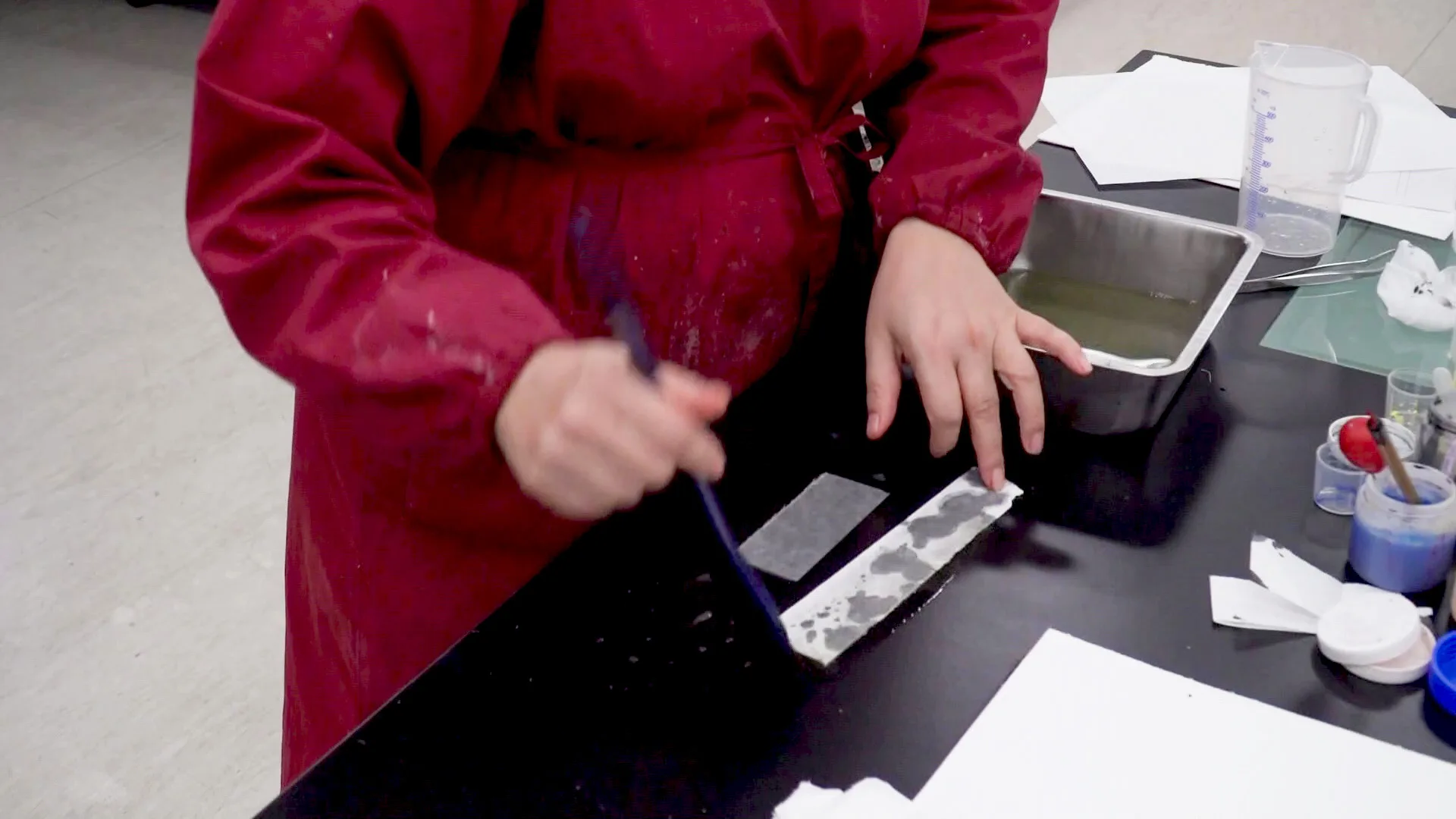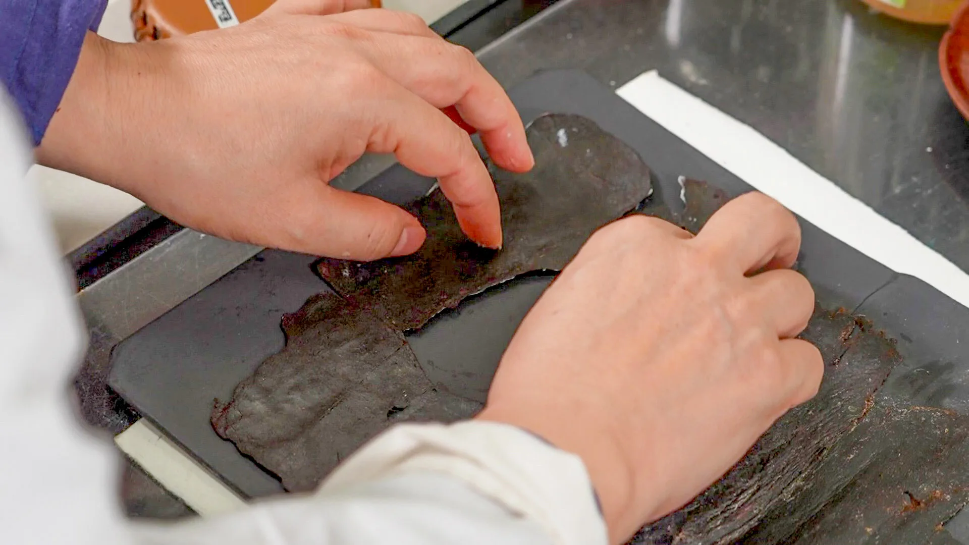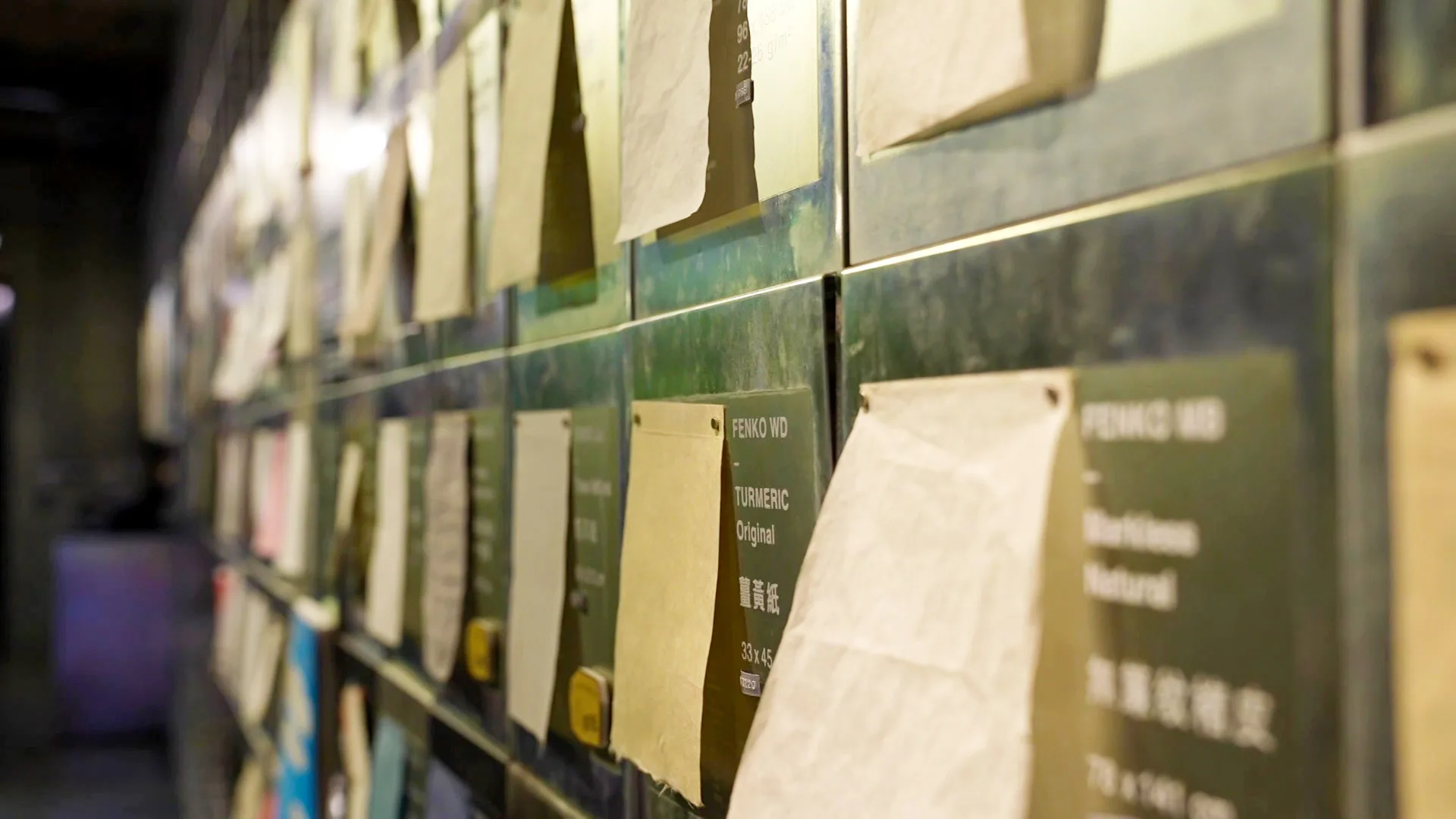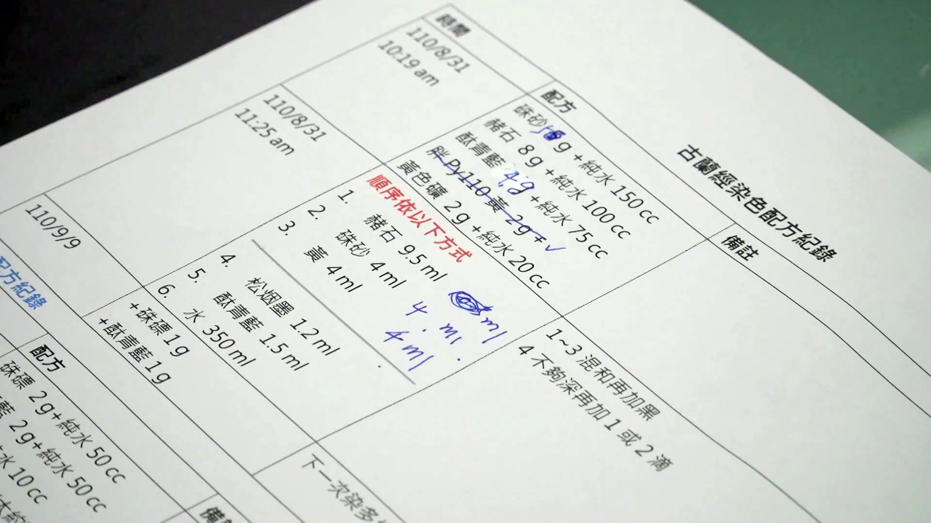 「麻紙的顏色很白,我們要想辦法把它染成做舊的感覺。」剛開始徐美文採取植物染,但總是染不出滿意的顏色,「我煮了很多植物,例如:黃柏加上墨、花椒加上墨,還是染不出合適的顏色。」多次失敗後,徐美文忽然想到,中東地區植物少的環境特性,因此,她改用礦物顏料,經過多次調配,總算確認配方。這是她與團隊從零開始摸索試驗而得。