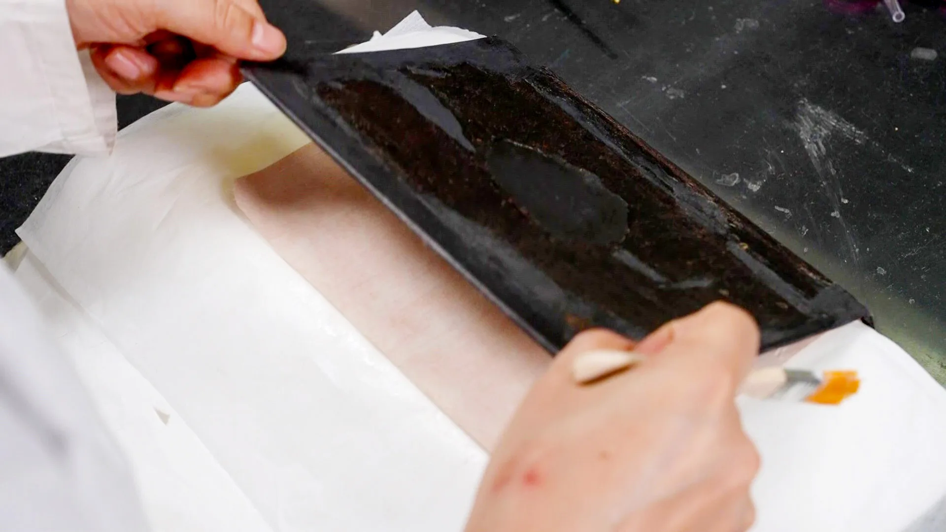 採用書畫裱褙技術修補紙張,徐美文讓每一頁經書都呈現視覺的美感,「我有學過書畫裱褙,所以我是第一次把書當成畫一樣來修補,所以每一頁的古蘭經,都像是一幅畫。」透過裱褙的方式修復,讓這本 500 年歷史的古蘭經書頁,每一頁都鍍上一層保護膜。